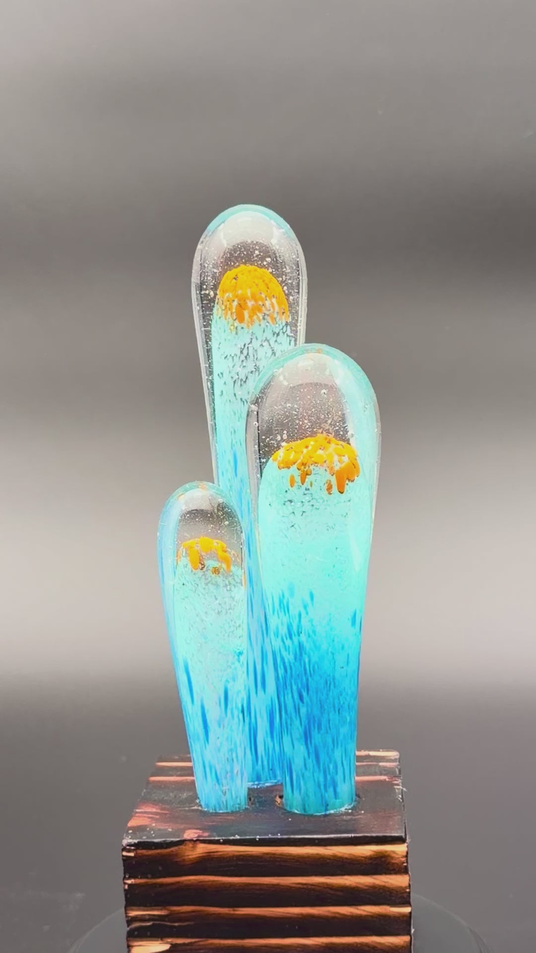 A striking, tall abstract blown glass cactus / succulent form — with bold color like a desert sunset meeting ocean water. Three elongated blue glass forms rise up from a charred pine cube base, each capped with molten orange detail. The clear tops give a water-like transparency while the blue fades into deeper tones, like desert twilight turning into ocean depth. At 10 inches tall, this is a dramatic, modern statement piece.
