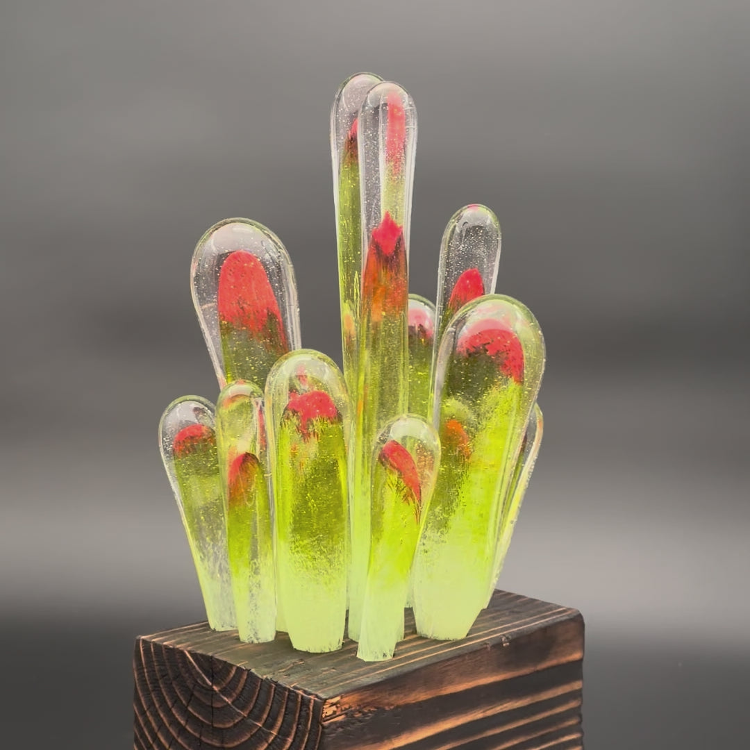 A vertical cluster of blown-glass succulent forms in chartreuse and ember red, rising organically from a charred wood base. The rounded, bloom-like tips give the impression of new growth emerging. Approximately 24" tall, 12" long, and 6" wide. A vibrant, one-of-a-kind statement piece ideal for shelving, entry displays, or modern gallery décor. Handmade.