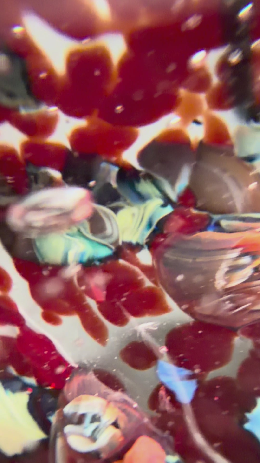 This 8 inch tall x 2.5 inch wide blown glass sculpture features intricate murrine reef color suspended inside a crystal clear outer layer. The form curves upward like a sea creature arm reaching toward the surface, with rich red/coral/blue/white tones swirling inside like living ocean. From every angle, it reveals new details — depth, texture, and motion frozen in time.